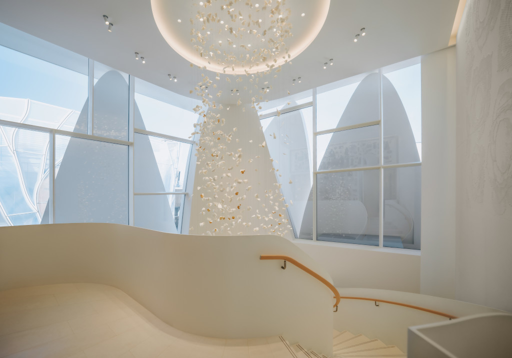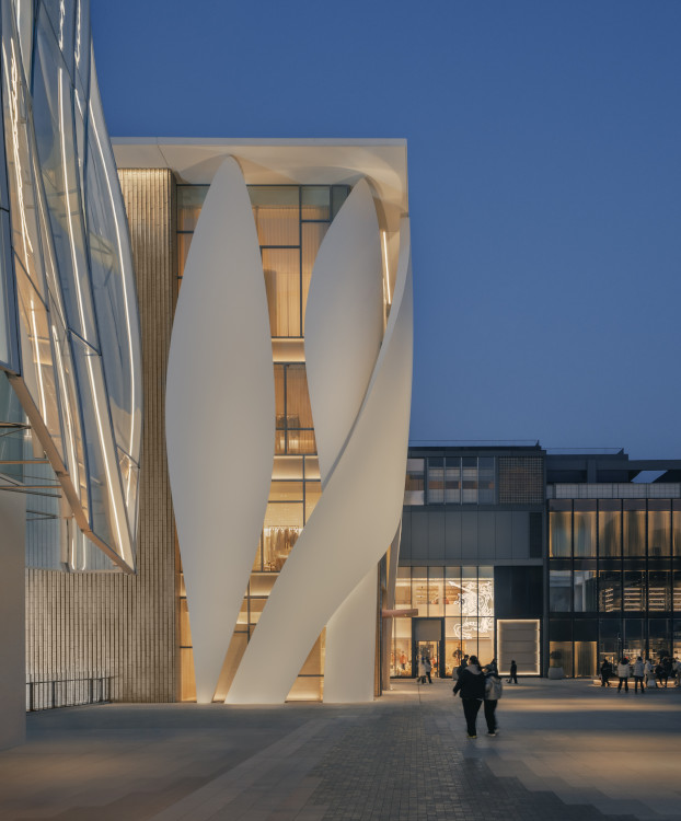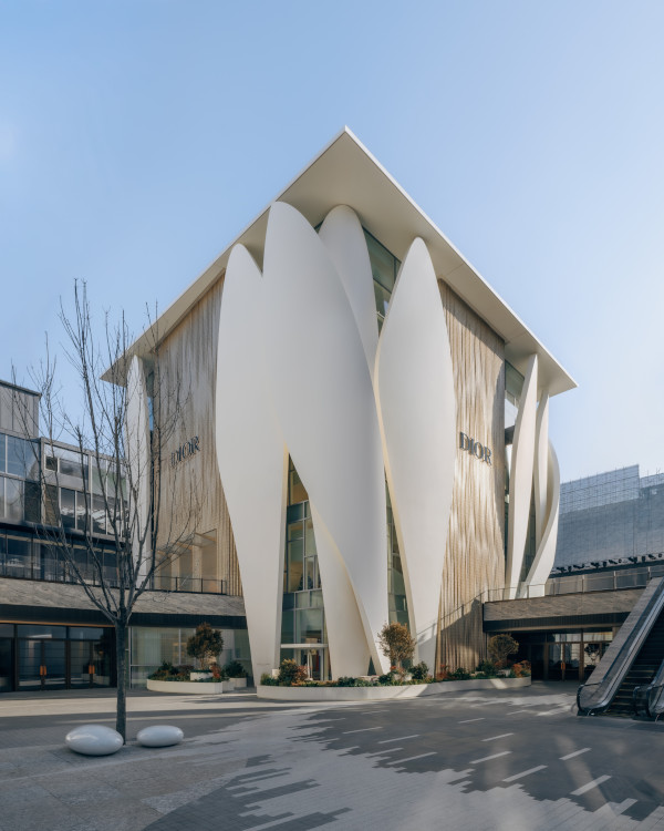 L’architecture des flagships Dior est pensée par Christian de Portzamparc comme une collection, dans la continuité de l’architecture sculpturale qu’il a réalisée pour les flagships à Séoul en 2015 et Genève en 2024. À Pékin, il imagine un écrin porté par quatorze coques blanches en forme de feuilles incurvées, souvent enroulées en spirales.