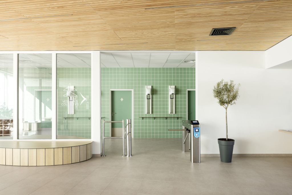 En partie centrale, le nouveau hall est le véritable espace d’accueil du public qui dirige les flux vers les vestiaires. Dès l’entrée, puis tout au long du parcours des baigneurs, un lien visuel est assuré avec la halle bassin grâce à la mise en place d’un patio et de transparences, apportant luminosité et ouverture à l’ensemble.