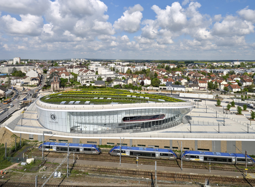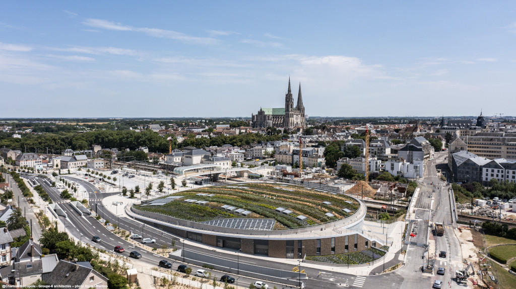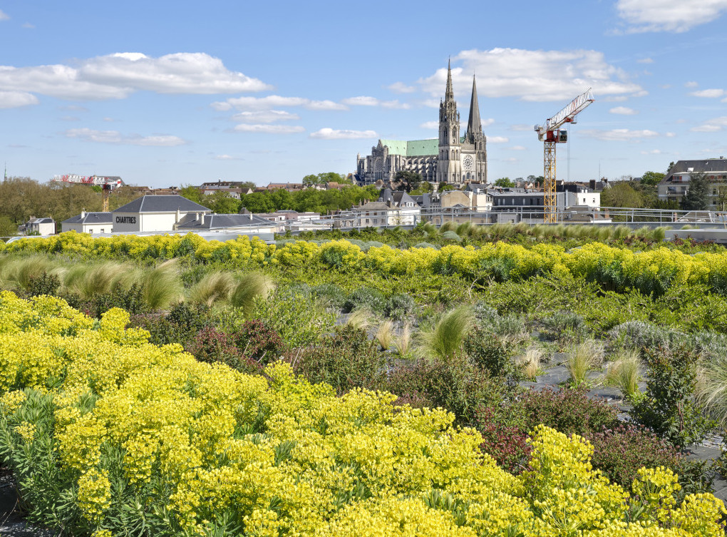 L’architecture du Colisée s’intègre harmonieusement dans la topographie chartraine. Semi-enterré, le bâtiment épouse la pente naturelle du site et limite son impact visuel. Vue du sud, la façade courbe et vitrée met en valeur le patrimoine ; vue du nord, elle forme un belvédère pour révéler la cathédrale et ses illuminations de Chartres en Lumières. Sa toiture végétalisée de 4 300 m², aménagée en jardin-promenade, prolonge l’esplanade urbaine et relie la ville au quartier de la gare.