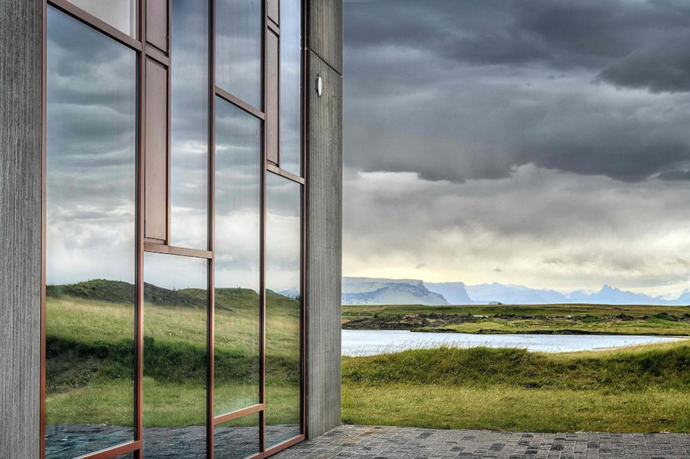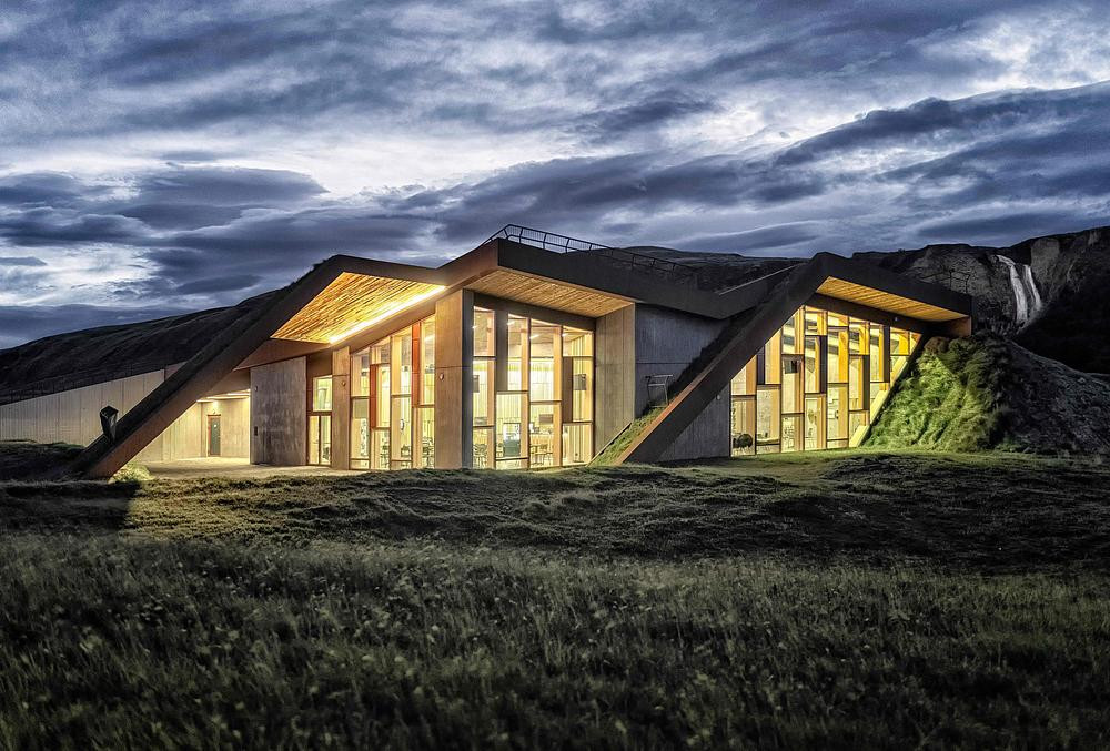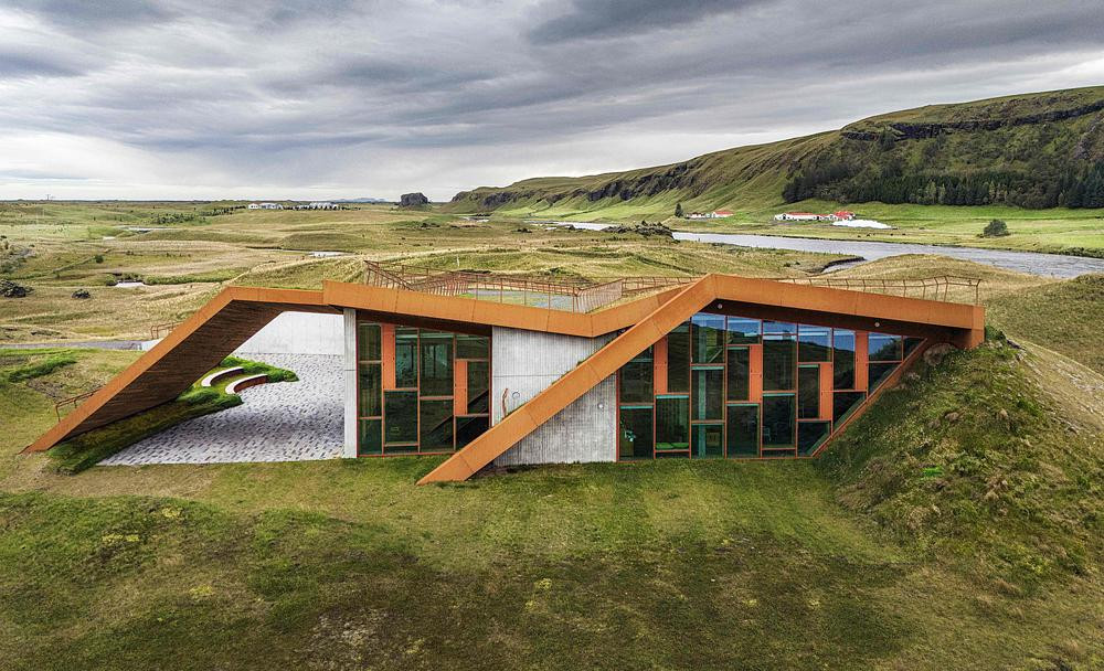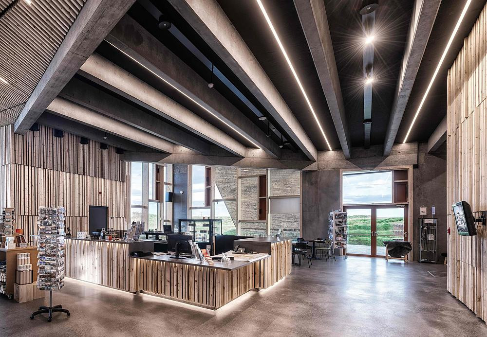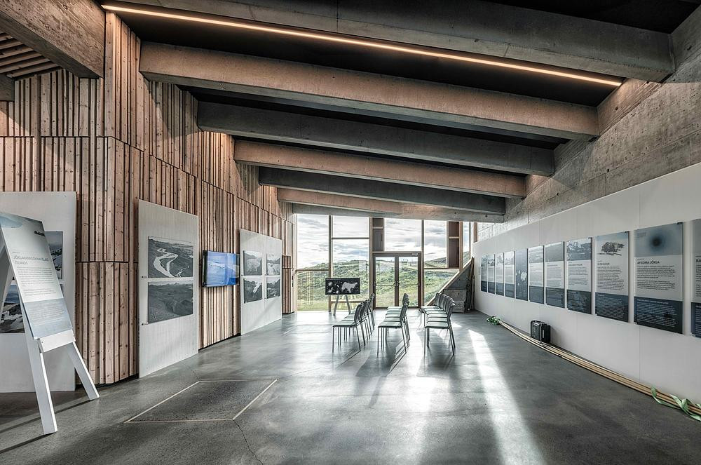Une passerelle et une plateforme d’observation sur le toit font partie de l’espace d’exposition, offrant aux visiteurs la possibilité de découvrir la géologie du site tout en admirant la vue sur le glacier Öræfajökull et le Hvannadalshnúkur, le plus haut sommet d’Islande, situé dans le parc national de Vatnajökull.