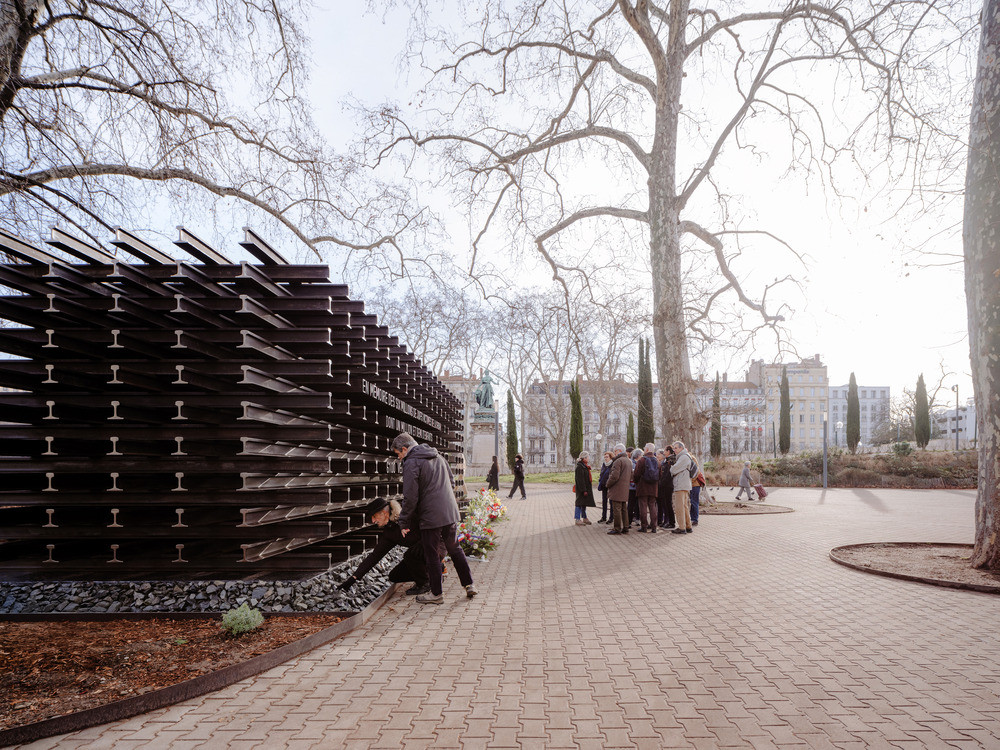 À Lyon (Rhône), pour l’Association pour l’édification d’un Mémorial de la Shoah à Lyon maître d’ouvrage, l’agence Blaising Borchardt Studio (BBS) a livré en 2025 les Rails de la Mémoire, une œuvre conçue avec des rails ferroviaires réemployés (donnés par la SNCF), ballast et traverses de chemin de fer. Dimensions : longueur : 14 m ; largeur : 5 m ; hauteur : 3,44 m. Coût de construction : 500 000 €. Communiqué.