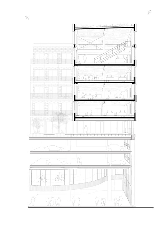 Le choix de la verticalité permet de limiter l’emprise au sol, favorisant un développement urbain économe en espace. Accessible à tous, le bâtiment est ouvert sur toutes ses faces. Rampes, escalators, tapis roulants, escaliers, monte-charge composent un système de circulation fluide et inclusif.