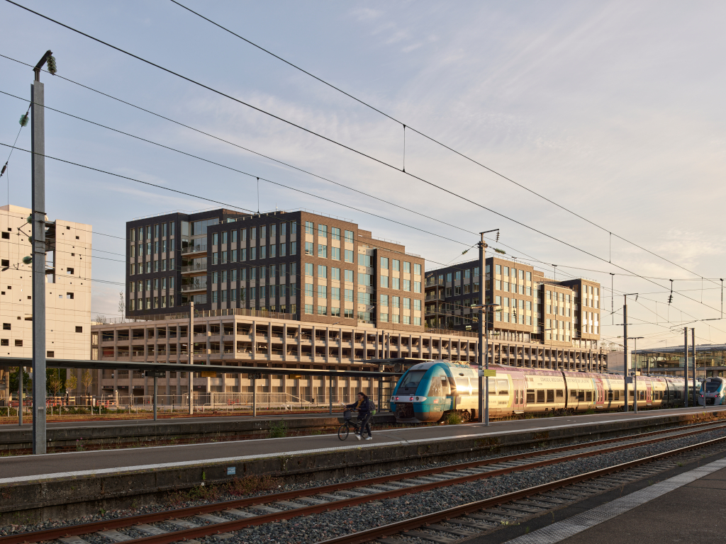 Conçu comme un nouveau marqueur urbain de la transformation du quartier, le projet fédère au sein d’un même volume, infrastructures de mobilité et deux sièges d’entreprises locales : Lucca et Lhyfe. L’ensemble est connecté à l’espace public par son emplacement contigu aux gares ferroviaire et routière et abrite l’un des plus vastes parcs de vélos de France avec une capacité de 1 470 emplacements.