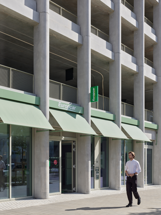 Depuis le hall, la mezzanine vitrée met en scène l’élément emblématique du projet : la boucle en « Grand 8 » du parc de stationnement vélo avec ses espaces circulables. Deux autres niveaux accueillent un parc de location automobile.