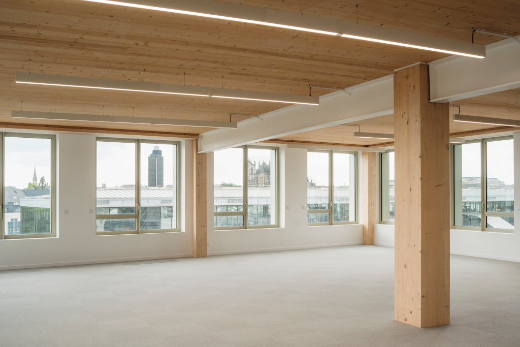 À l’intérieur, les bureaux s’affirment comme un véritable manifeste du bois apparent avec une structure en bois massif et des planchers en CLT laissés visibles, sans faux plafonds. L’ensemble des réseaux – ventilation, fluides – est intégré dans un plancher technique, libérant les volumes et révélant le bois. Ici, la matière brute incarne un minimalisme radical et une frugalité assumée. Par sa douceur, le bois crée une atmosphère chaleureuse, propice au bien-être.