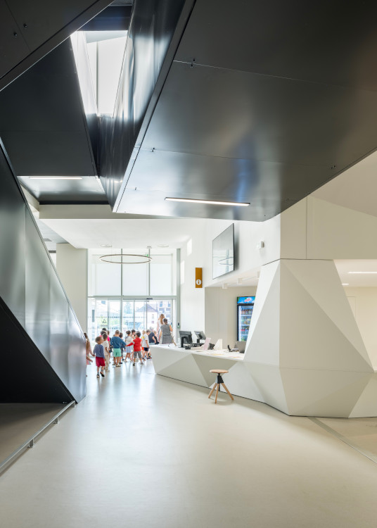 Libérées des contraintes de gabarit, les salles de cinéma sont implantées dans un volume haut posé sur le socle. Ce geste architectural signale l’équipement depuis le centre-ville et est le support de la grande enseigne. La toiture-terrasse de la médiathèque est entièrement végétalisée. Elle facilite la régulation des eaux de pluie, augmente les performances thermiques du bâtiment et participe à la biodiversité du lieu. Les autres toitures, ainsi que les façades, sont en ardoise, matériau couramment utilisé dans la région. Le volume de l’atrium qui reçoit l’escalier monumental en verre dépoli fait office de lanterne lumineuse le soir.