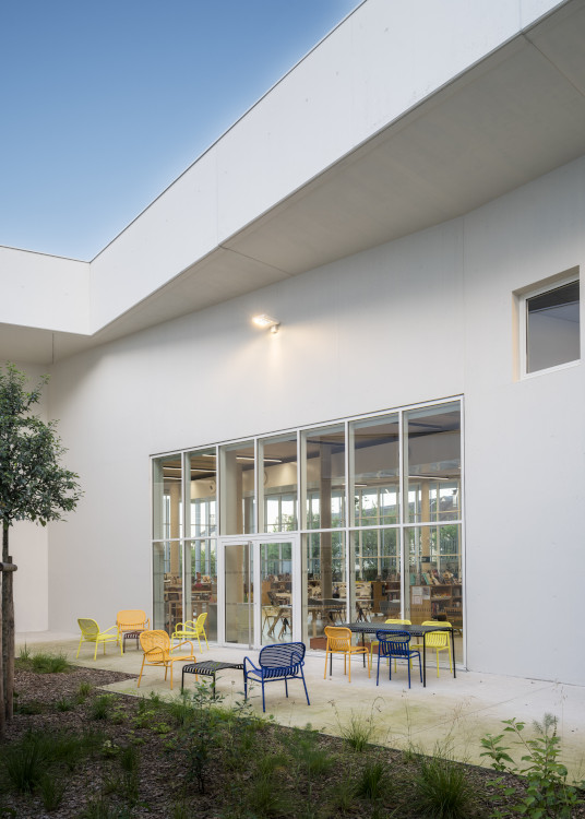 À l’instar de cet espace, la médiathèque est ouverte sur la ville. Ses façades largement vitrées, à l’est sur la place et au sud/sud-ouest le long de la rue des Marnières, assurent l’éclairement naturel et la transparence entre intérieur et extérieur. Au centre, un large patio vitré apportera le complément de lumière naturelle. Les apports solaires sur la façade sud sont contrôlés par un filtre végétal constitué de plantes grimpantes et une maille métallique. Un débord de toiture au sud et à l’est fait également office de protection solaire zénithale.