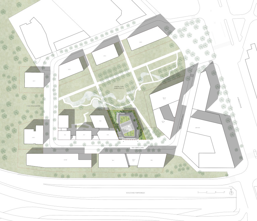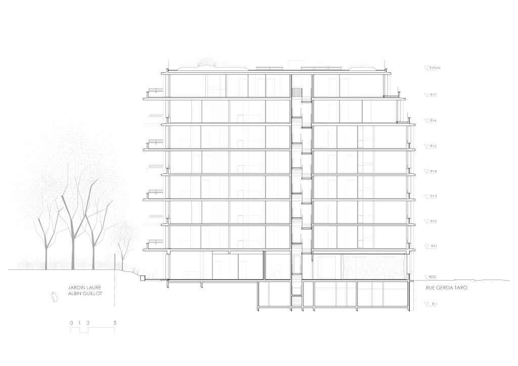 En bordure nord du jardin, trois plots s’alignent et longent avantageusement le paysage, en bordure sud, les bâtiments forment un peigne composé d’une succession d’épis ouverts sur le jardin. Ce nouveau front bâti le long de la rue Gerda Taro est entrecoupé de porches surmontés de jardins d’hiver qui laissent pénétrer la lumière du sud et offrent des vues sur le cœur végétal du quartier depuis la rue. Le projet architectural des 36 logements sociaux s’inscrit pleinement dans cette figure urbaine. Véritable articulation, il complète le front bâti de la rue Gerda Taro, tout en ouvrant vers le jardin.