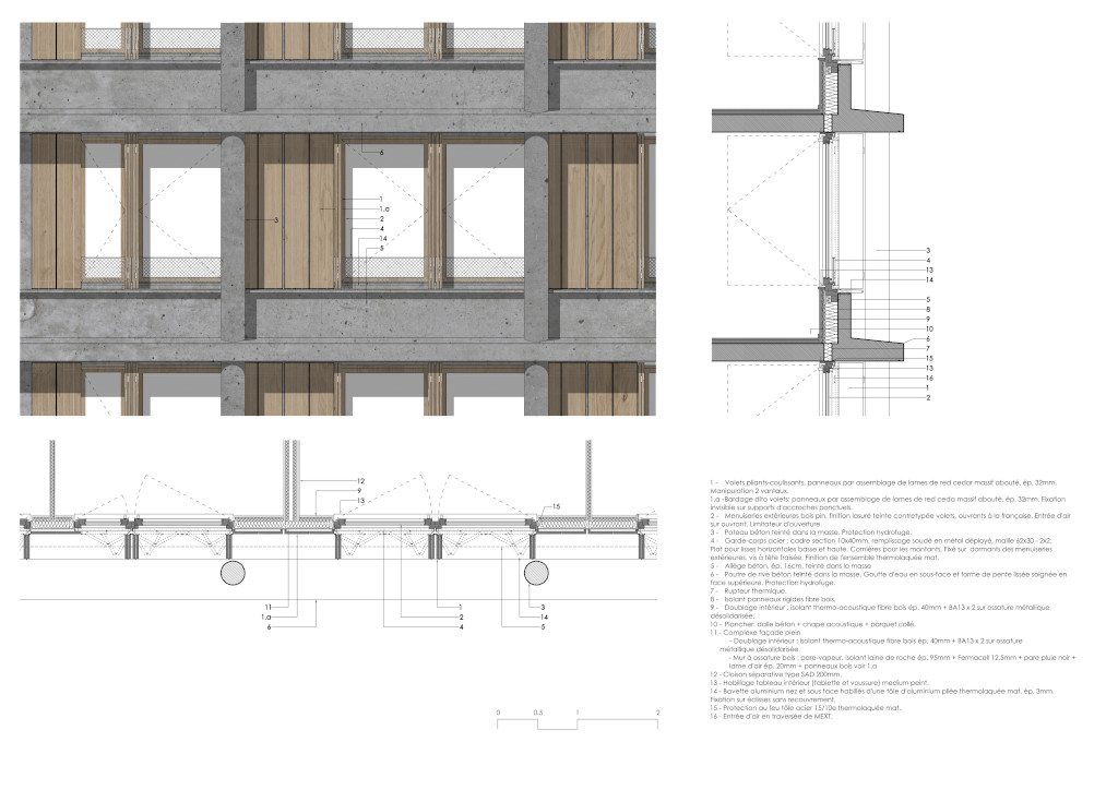 Ce mode constructif mixte se manifeste dans une syntaxe élémentaire associant béton et bois. L’ossature en béton teinté dans la masse est composée, à l’image de la maison Dom-Ino, de dalles et de poteaux dont les assemblages et l’ordonnancement se donnent à voir en façade. Les dalles en débord forment des brise-soleil efficaces, protègent le bois des intempéries et ralentissent la propagation du feu en façade.