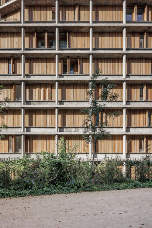 Des allèges basses filantes, à tous les niveaux, complètent l’ossature béton afin de préserver l’intimité des logements et de faciliter l’ameublement des pièces. Les allèges sont surmontées de bandeaux bois filants constitués de panneaux menuisés en red cedar massif qui bardent les parties pleines et occultent les parties vitrées par un système de volets pliants coulissants. La dynamique des volets anime les façades au rythme des journées et des saisons. Les ensembles menuisés tempèrent la minéralité de la structure apparente et confèrent à l’immeuble son échelle domestique.