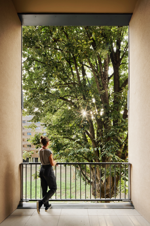 En façade, des « fenêtres urbaines » viennent rythmer les circulations. Lieux de repos et de contemplation, elles sont un outil de rupture de la monotonie et apportent naturellement de la lumière dans les espaces.