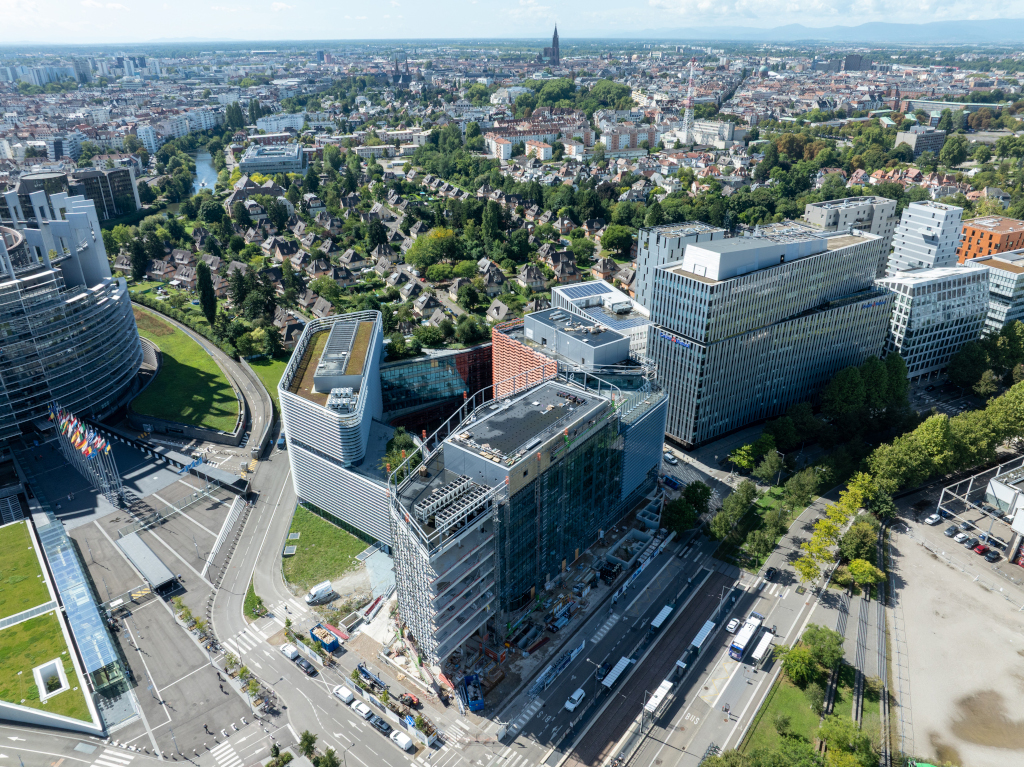 À la croisée de l’innovation architecturale, du confort d’usage et de l’exigence environnementale, Osmose 2 s’impose comme un projet emblématique, préfigurant l’avenir du bureau à Strasbourg. Après la livraison d’Osmose 1 en 2021 – première tranche désormais occupée par le Parlement européen –, Oslo architectes et ArtBuild Architectes ont engagé en 2024 la seconde phase du programme représentant 19 088 m² de surface de bureaux. Ces derniers sont conçus pour répondre aux standards contemporains en matière de performance énergétique, de qualité des espaces de travail et de durabilité.