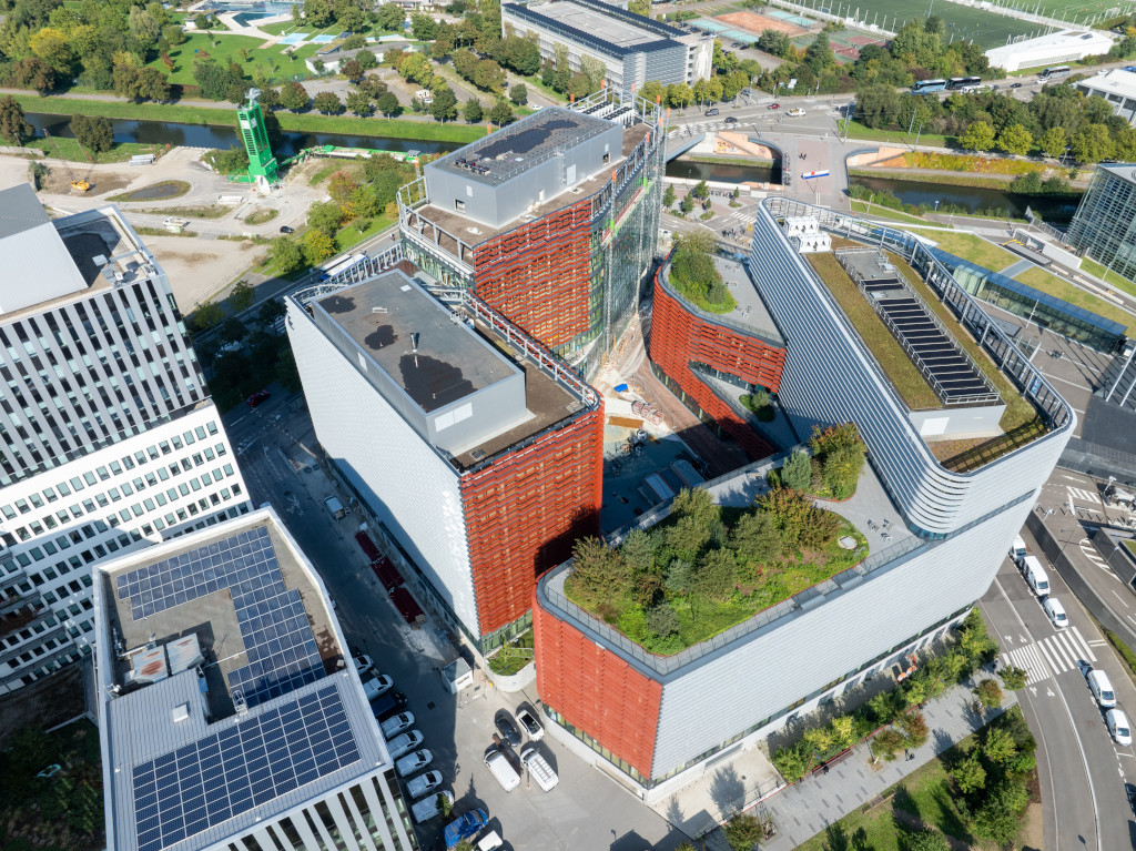 Le bâtiment se distingue par son approche innovante en matière de performance énergétique et environnementale : une architecture bioclimatique optimisée, l’intégration de panneaux photovoltaïques, l’utilisation d’un béton bas carbone et de matériaux recyclés.