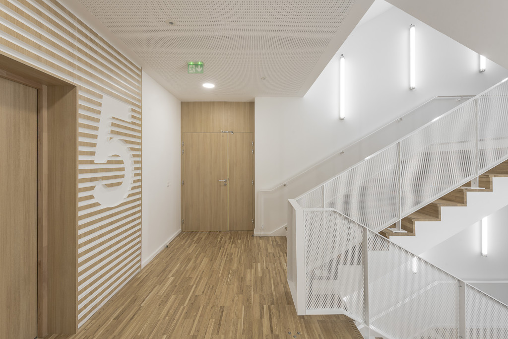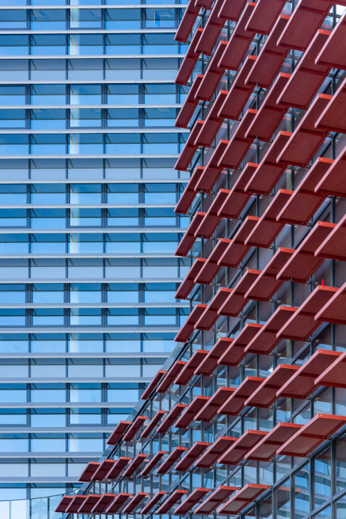 La conception des brise-soleil a fait l’objet d’un dimensionnement précis : profondeur et inclinaison varient selon l’orientation des façades, faisant de ces dispositifs un élément structurant de la composition d’ensemble. Interface entre l’intérieur et l’extérieur, la façade constitue un élément majeur de l’expression architecturale mais également un élément essentiel au confort et au bien-être des utilisateurs.