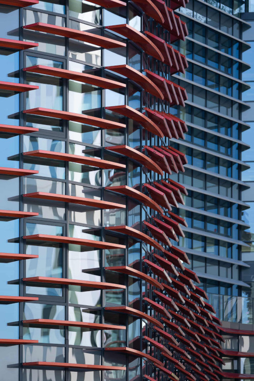 Avec ses brise-soleil fixes, la façade est au centre de la stratégie énergétique et des transferts thermiques entre l’environnement extérieur et l’ambiance intérieure. Les brise-soleil en métal perforé à géométrie variable ont fait l’objet d’un développement scientifique (inclinaison, profondeur, taux de perforation), tenant compte du diagramme solaire d’application. Leurs teintes rappellent à la fois le gris métallique des enveloppes du Parlement et les nuances rougeâtres de la cour intérieure Louise Weiss. En attique (R+8), une ossature complémentaire prolonge le système de brise-soleil afin de réduire l’impact visuel des locaux techniques en toiture.