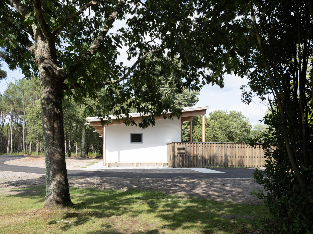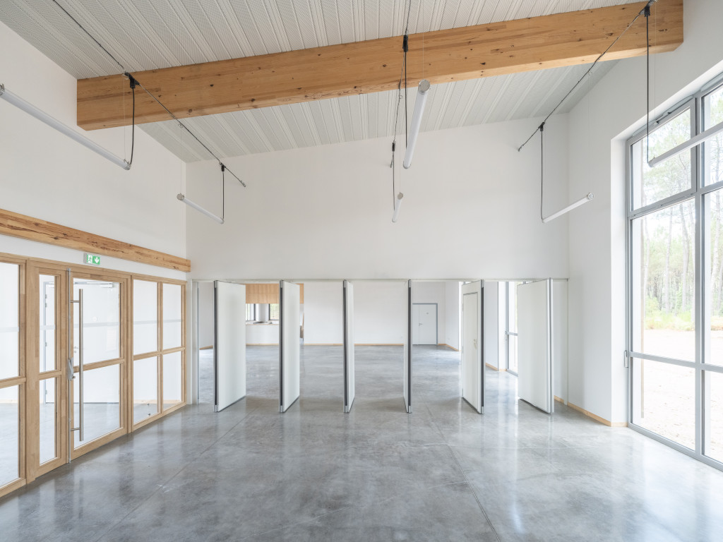 La salle polyvalente est un espace fluide, ouvert sur le territoire. Légèrement à l’écart, dans la partie nord du site, elle est implantée à la lisière de la forêt. Sa silhouette horizontale, étirée et basse, souligne la profondeur du paysage forestier et la masse végétale des pins. L’architecture joue ici la carte de la transparence, de l’ancrage au sol et de la simplicité constructive.
