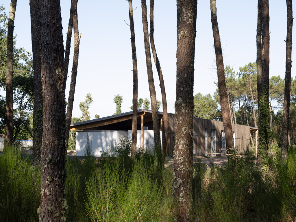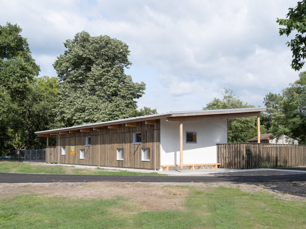 L’ensemble de l’opération se développe en deux volumes distincts, sur un seul niveau, avec des toitures mono-pente qui s’étendent largement jusqu’à proposer des espaces extérieurs couverts, en préau et en galerie. Les gabarits et les hauteurs sont réglés en fonction de la masse végétale des arbres. Dans une alternance de pleins et de vides, de grandes ouvertures cadrent des vues privilégiées sur le paysage, entretenant un dialogue constant entre intérieur et extérieur, et offrant aux usagers une immersion totale dans l’environnement.