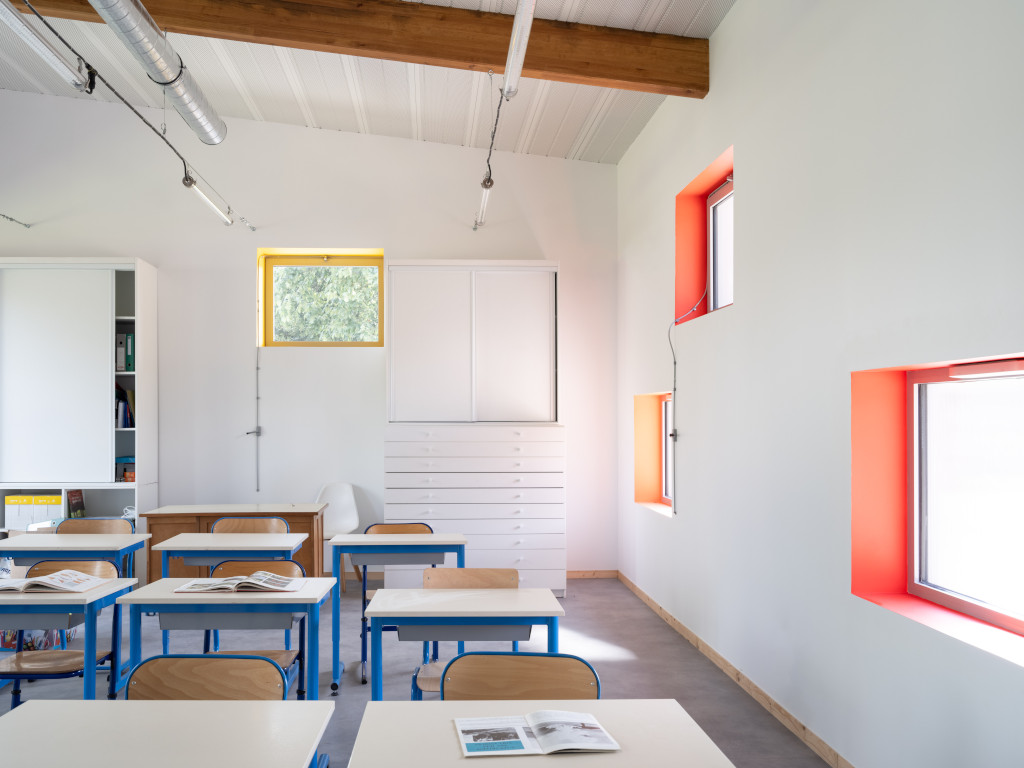 L’échelle du bâti est volontairement maîtrisée, pensée pour les enfants comme pour les adultes qui les accompagnent. À l’intérieur, l’ambiance appelle au calme. Les matières – bois, enduit clair, métal discret – prolongent la logique d’une architecture pédagogique, conçue autant pour apprendre à habiter un lieu qu’à faire corps avec un territoire.