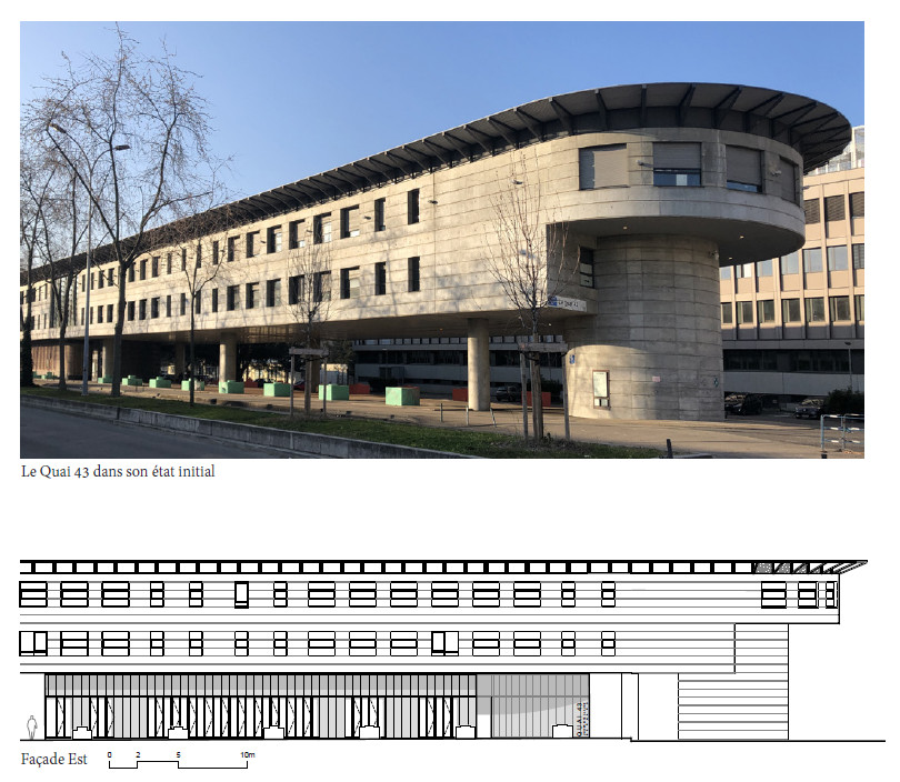 Techniquement, le projet neuf est désolidarisé de l’existant et la gestion de l’interface avec le Quai 43 a été un sujet majeur. L’espace et la hauteur limités, l’accès complexe pour les engins ont invité les concepteurs à réfléchir au mode constructif très tôt. La recherche de matériaux simples, préfabriqués et facilement transportables a conduit au choix d’une structure métallique poteaux-poutres, utilisée dans le monde industriel. L’enveloppe en bardage de polycarbonate contraste avec le béton brut de l’édifice existant. Il crée des effets de reflets irisés changeants suivant la lumière. Le rythme des ouvertures reprend celui du bardage (60 cm x 3 m) et crée une verticalité en façade qui vient contraster avec l’horizontalité du Quai 43.