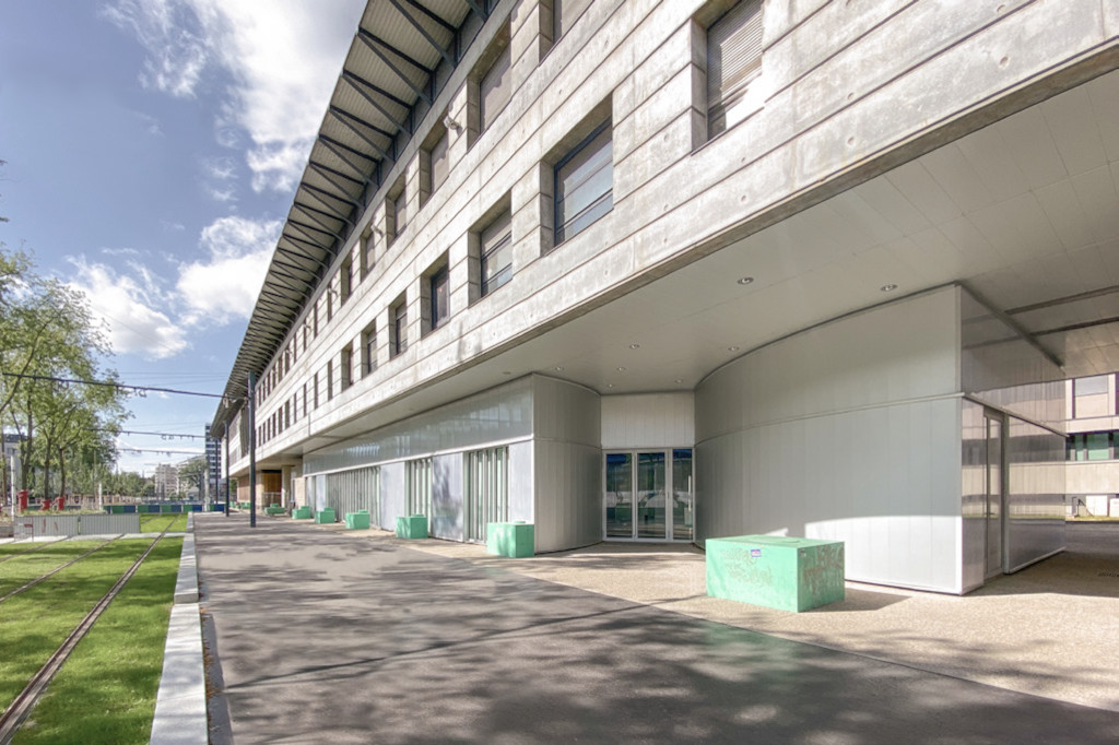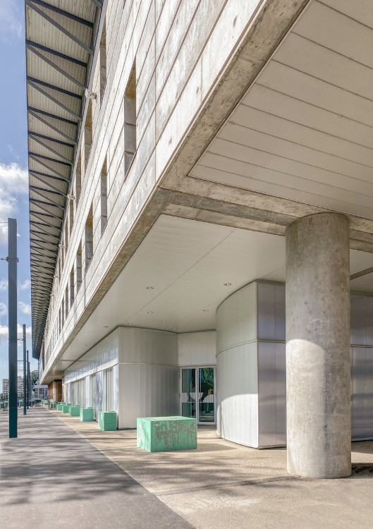 À l’entrée du campus, un grand bâtiment-pont en béton brut marque un passage, une limite entre l’intérieur et l’extérieur du site. Construit par l’agence Eyraud-Traynard, devenue par la suite Métropolis Architectes Associés, au début des années ‘90, il affirme un bâtiment massif, construit sur pilotis, dont le rez-de-chaussée propose un « sol libre » pour le traverser et libérer les vues.