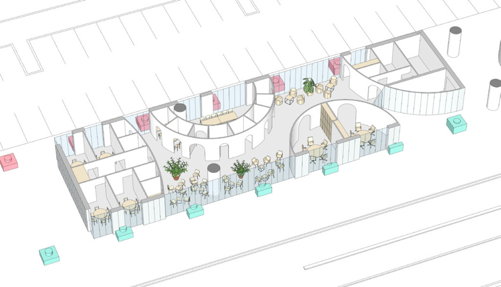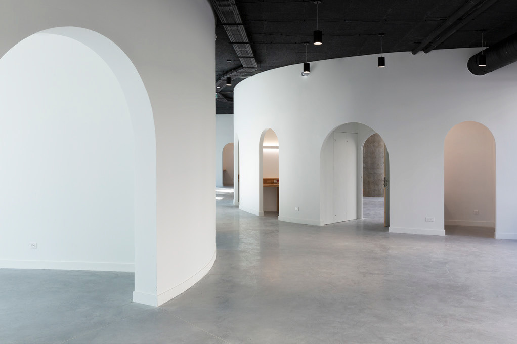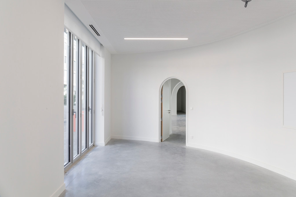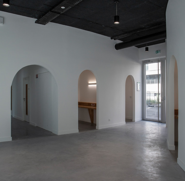 Les cloisons séparatives sont courbes et les portes cintrées apportent une ambiance douce, ouverte et conviviale. La forme circulaire reprend la géométrie du Quai 43, avec ses grandes casquettes arrondies, piliers et cages d’escalier.