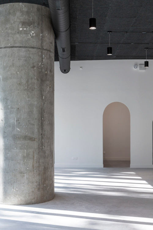 L’espace de distribution centrale devient un espace capable, pouvant être aménagé suivant les envies, les besoins et les temporalités de la vie étudiante. L’emploi de peu de couleurs confère à l’ensemble une forme de spiritualité, un lieu calme qui invite au respect. Les architectes ont souhaité conserver une expression pure avec la radicalité du noir et blanc, complétée par un sol en béton gris et un mobilier en bois dessiné sur mesure. Les différents lieux de travail sont entièrement blancs ; la distribution centrale conserve un plafond noir pour jouer de contraste et pour dissimuler les éléments techniques restés apparents.