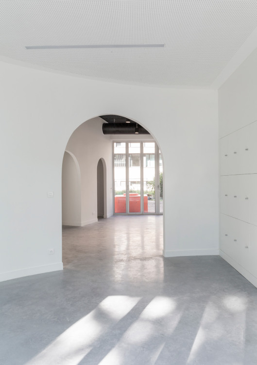 D’abord, les architectes ont voulu respecter l’architecture du Quai 43 en conservant le sol libre qui existait sous les pilotis. Pour cela, ils maintiennent les vues traversantes et les transparences d’un côté à l’autre du projet. Ils échappent au schéma du couloir de distribution traditionnel, sombre et fermé, et privilégient une circulation organique et fluide autour de laquelle s’organisent les différents volumes.