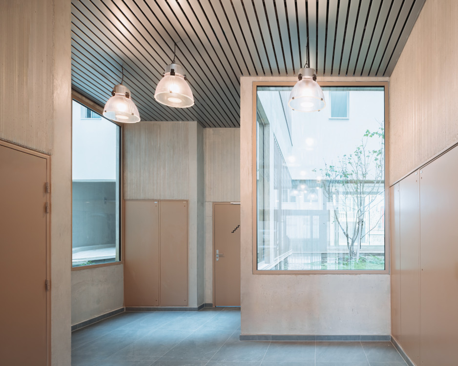 Par contraste, les lumineux espaces intérieurs sont traités de manière contemporaine en béton matricé lasuré et claustras métalliques.