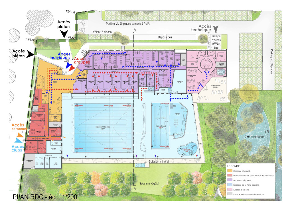 « L’intérêt est de concevoir des bâtiments qui fonctionnent bien tout de suite. L’usine, sous les bassins, ce sont de gros volumes qu’il faut intégrer très tôt car ce qu’il y a en dessous remonte au-dessus, les gaines des vestiaires par exemple. Cette réflexion permet d’anticiper l’exploitation technique sans surconsommation », précise Jean-Luc Calligaro, associé de Po & Po.
