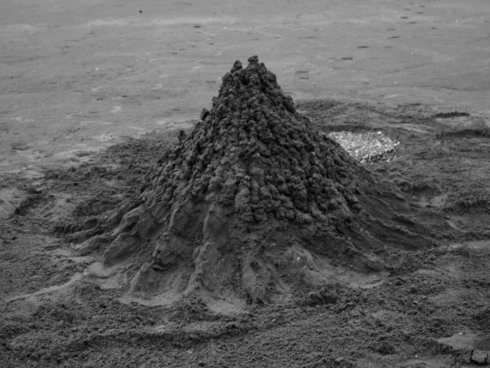 Sur le sable justement, elle retrouve ce bonheur d’une force constructive attirée par l’attraction terrestre. Le sable mouillé et coagulé fabrique patiemment, pincée après pincée, une petite montagne. « La granulométrie était fantastique, la montagne montait bien, il fallait aller vite et le sable œuvrait avec cette énergie ».