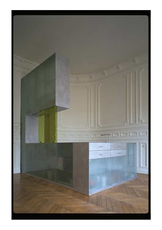 Dans un registre plus intime, la Glass Kitchen est un ovni domestique conçu avec Louis Paillard dans les années 2000 pour un appartement de l’avenue Bosquet à Paris (VIIe), un meuble en verre géant et traversant… Trois pièces dans une structure importante et suspendue capable de porter un grand nombre d’ustensiles lourds à dissimuler et aussi de belles choses qui peuvent être visibles sans les exposer, « quelque chose d’aérien et quelque chose de caché, qui inscrive la contemporanéité dans un immeuble haussmannien ». Tout elle…