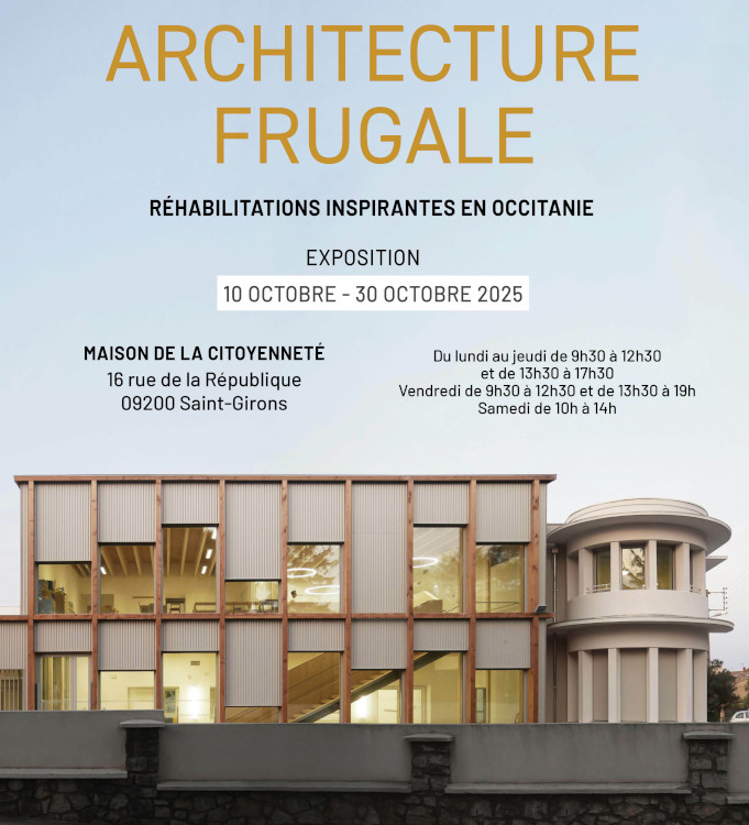 La Maison de la Citoyenneté à Saint-Girons (Ariège) présente l’exposition « Architecture Frugale – Réhabilitations inspirantes en Occitanie ». Jusqu’au 30 octobre 2025.