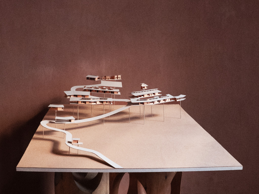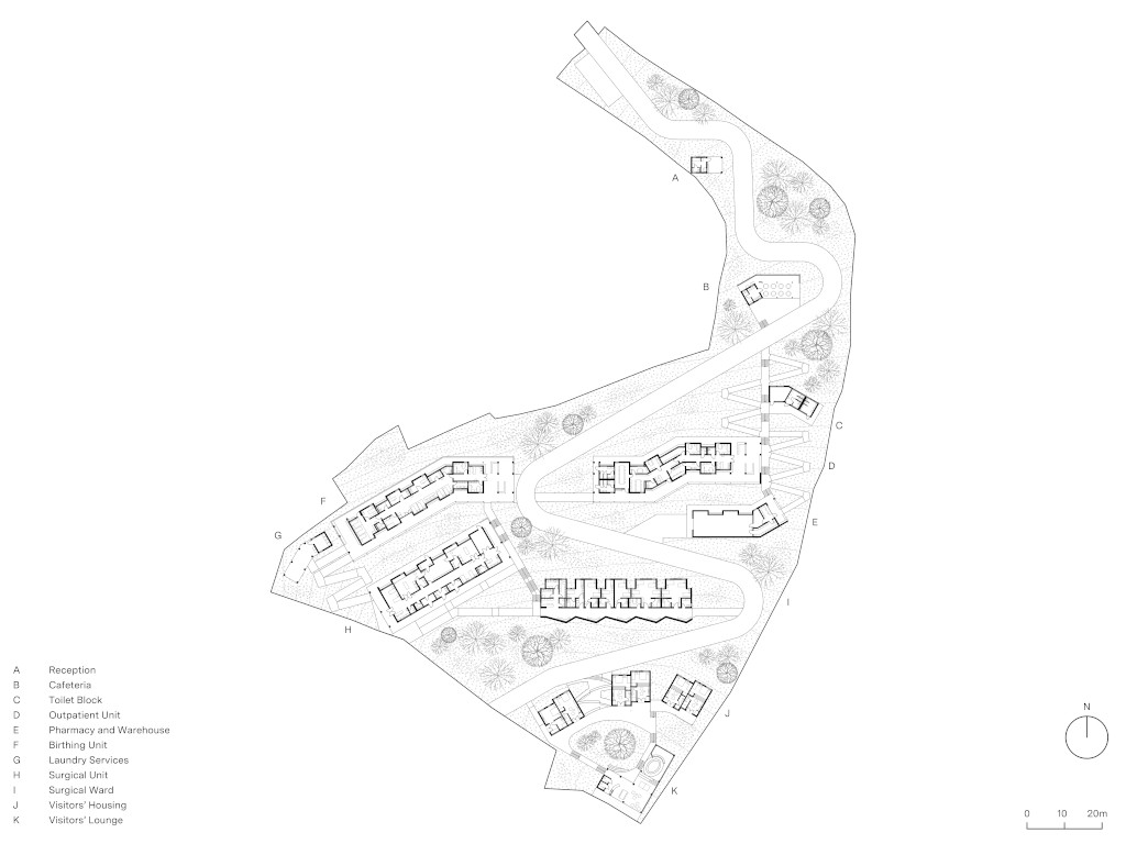Les dix bâtiments qui composent la clinique sont répartis de manière à optimiser la proximité fonctionnelle entre les services et à garantir une circulation fluide et intuitive pour le personnel, les patients et les visiteurs. Les pavillons épousent les courbes de niveau du site, minimisant ainsi les travaux de terrassement et de remblayage tout en préservant le profil originel de la colline. Tous les bâtiments sont orientés en fonction des vents dominants afin de maximiser la ventilation naturelle et d’assurer un confort thermique optimal sans recourir à des systèmes mécaniques.