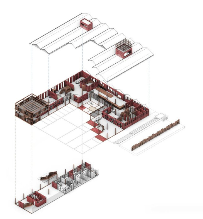 Le château d’eau du complexe, généralement construit en béton, a été repensé comme une structure spatiale en bois recouverte d’une surface photovoltaïque. Cela garantit l’alimentation ininterrompue du bâtiment en électricité et en eau dans un environnement caractérisé par de fréquentes coupures de courant.