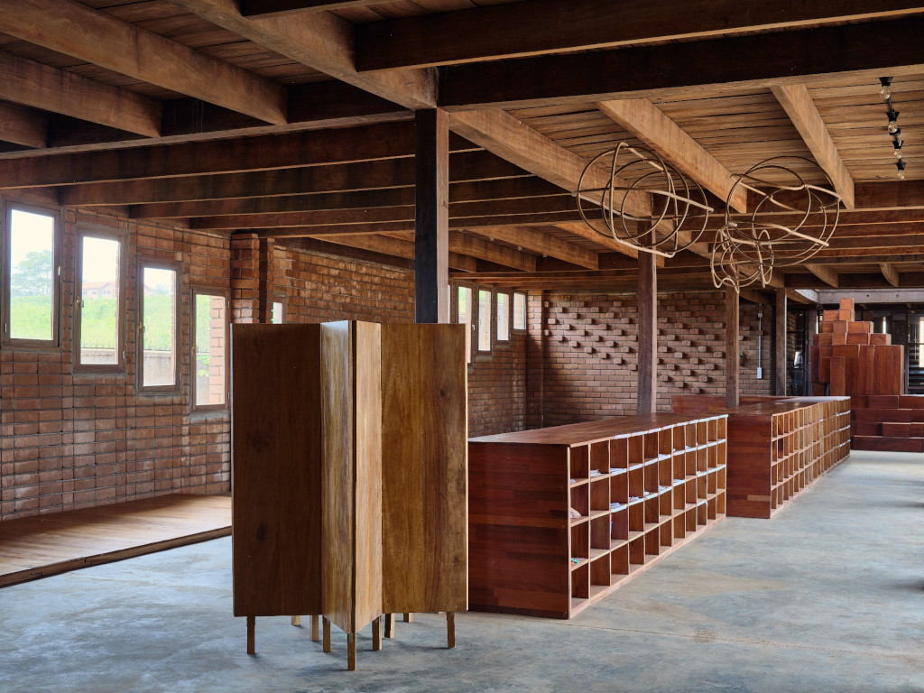Pour construire African Flow, une étude approfondie a été menée auprès de fabricants locaux exportant généralement leurs produits vers l’Europe ou la Chine. La structure a ensuite été construite en azobé, un bois local de haute densité qui se distingue par sa résistance aux termites. La construction a été réalisée par des ouvriers locaux sans expérience préalable du bois, favorisant ainsi un processus d’apprentissage collectif reproductible pour de futurs projets et favorisant une construction à faibles émissions dans un contexte d’urbanisation rapide.