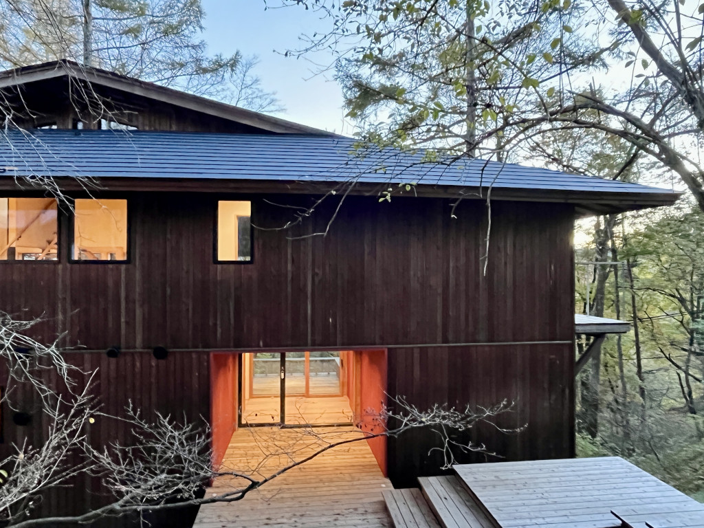 Réalisée en structures bois, elle est couverte, tel un Janus à deux têtes, par deux formes de toitures différentes : au sud un type à deux pans kirizuma dont la forme permet d’accueillir l’étage supérieur ; au nord un type à pignon coupé irimoya réduit la masse visuelle de l’édifice depuis la route. Afin de minimiser son empreinte écologique et de l’intégrer à son environnement la maison est recouverte de lattes de bois débitées directement dans les troncs de mélèzes coupés sur la parcelle.