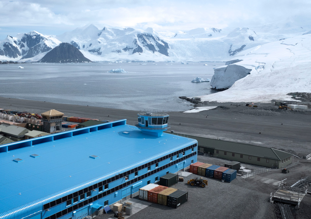 Des nuances de bleu éphémères dans le ciel et la glace contrastent avec le paysage blanc et gris de l’île Adélaïde, près de la péninsule Antarctique. Désormais, une vaste structure intensifie ce bleu, d’une teinte que l’architecte Hugh Broughton nomme « bleu Discovery ». Il la baptise ainsi en référence au grand bâtiment rectangulaire Discovery que le cabinet Hugh Broughton Architects a conçu pour le British Antarctic Survey (BAS) à la station de recherche Rothera, à 1 800 km au sud de la pointe de l’Amérique du Sud. Ce bâtiment aérodynamique et multifonctionnel représente la dernière avancée dans le domaine en constante évolution de l’architecture habitable pour l’environnement le plus hostile de notre planète, où les températures peuvent chuter bien en dessous de celles de Mars.