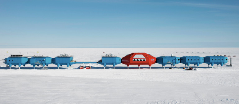 La conception primée de Broughton pour les huit volumes reliés de la station Halley VI (2013) du BAS évoque un train sur pattes, dont les pieds sont des skis, car l’ensemble de la structure doit être déplacé au gré des mouvements de la barrière de glace de Brunt sur laquelle elle repose. La station espagnole Juan Carlos 1 et la station australienne Davis (2022), ainsi que la base néo-zélandaise Scott en cours de réaménagement, sont toutes conçues par Hugh Broughton et surélevées, mais ne sont pas mobiles. « Extrêmement novateurs », selon lui, sont les bâtiments cylindriques reliés (2013) conçus par Patrice Godon pour la station franco-italienne Concordia, située au Dôme C sur le plateau antarctique. Ses pieds hydrauliques indépendants permettent de la surélever pour la maintenir au-dessus de la neige qui s’accumule.