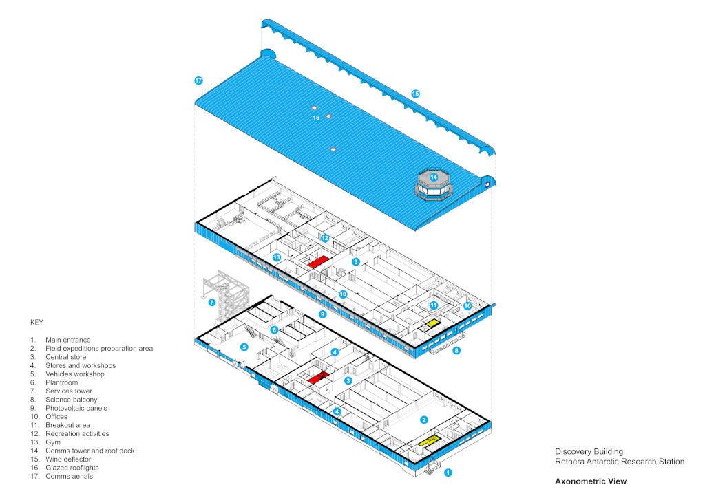Le bâtiment Discovery, de deux étages et d’une superficie de 4 500 m², présente un plan rectangulaire et repose sur un sol de gravier concassé et compacté. Selon l’architecte, ce sol « permet l’infiltration de l’eau de fonte, l’empêchant ainsi de geler comme ce serait le cas dans un contexte de pergélisol classique ». La dalle de béton et les fondations sont isolées du sol par une isolation thermique épaisse. Un revêtement en panneaux composites bleus et un triple vitrage assurent l’isolation du bâtiment. À l’intérieur, le rez-de-chaussée abrite des réserves, des ateliers, un mur d’escalade se prolongeant au premier étage et un centre médical mais la pièce maîtresse est la salle de préparation des expéditions de terrain. « Autrefois, une grande partie des recherches scientifiques étaient menées à l’intérieur de la station, alors qu’aujourd’hui, une part importante se déroule très loin des côtes », souligne-t-il.