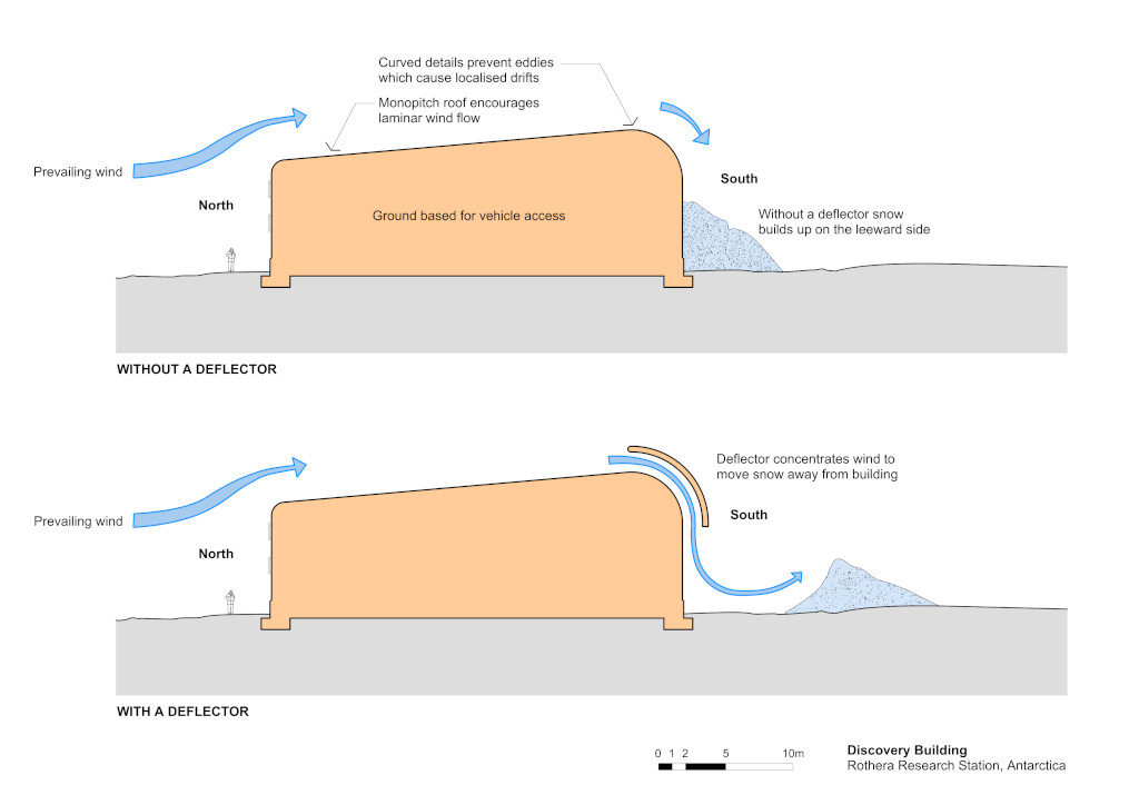 Peu de vestiges des anciennes constructions antarctiques subsistent en raison de l’environnement extrêmement hostile. Le vent y est un ennemi redoutable, accumulant la neige derrière tout ce qu’il rencontre. « Si la neige s’accumule contre un bâtiment, elle peut geler par temps froid et endommager sa structure », explique Hugh Broughton. C’est pourquoi on distingue deux types de bâtiments : ceux construits au niveau du sol et ceux surélevés. Comme l’explique Broughton, « lorsqu’un bâtiment est surélevé, le vent le comprime et s’engouffre sous la structure. Cela contribue à dégager la neige et à éviter la formation de congères contre le bâtiment ».
