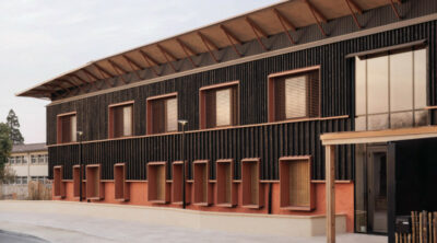 Le nouveau bâtiment d’ateliers est implanté à l’angle nord-est de la parcelle, afin de constituer un front bâti le long de l’avenue de la Jallère et de rendre son accès plus autonome. Il se compose au rez-de-chaussée d’une salle de conférences et des ateliers de formation aux métiers du bâtiment en double hauteur, ainsi que de salles de classe en mezzanine.