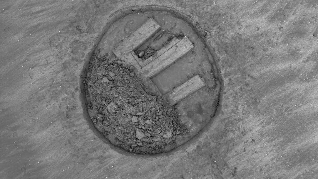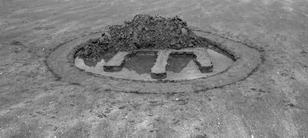 En sable, en 70 minutes chrono. Avec la belle lumière. Creuser. « Je me suis vite rendu compte que quand je creusais dans la matière sable, j’avais des déblais ! Qu’est-ce que je fais du sable que j’enlève pour voir le plan et me mettre en opposition avec autre chose ? ».