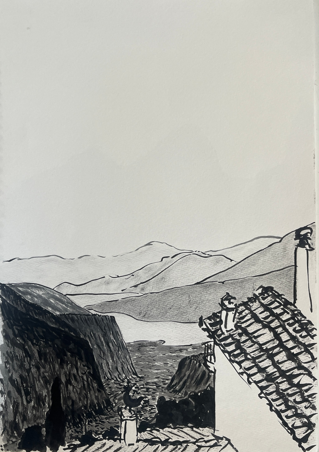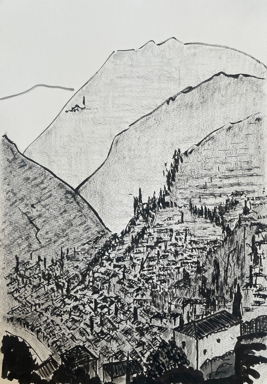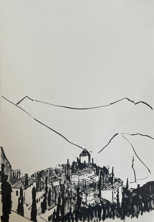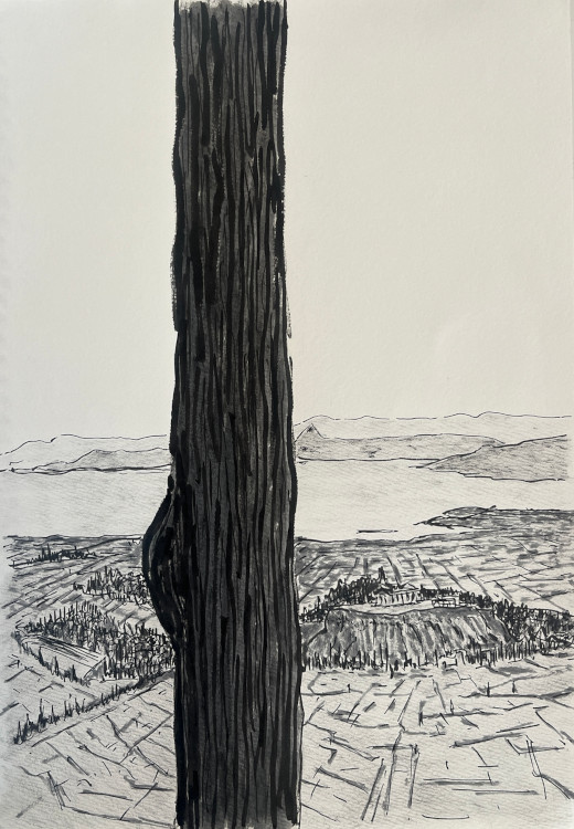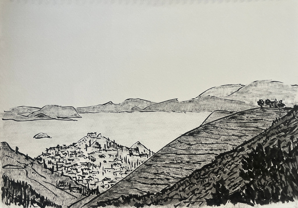 Le vol depuis Tokyo, avec escale à Istanbul, décrit une horizontale, une translation latitudinale, la ligne la plus courte depuis l’Extrême-Orient. Elle est suivie d’une heure de descente quasi verticale pour traverser la mer Égée avant d’atterrir à Athènes. Carnet de dessins.
