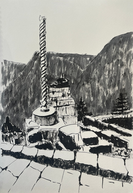 Le lendemain nous montons le chemin du sanctuaire panhellénique au pied du Parnasse que je ne peux m’empêcher de voir à travers les croquis tremblés d’Aalto. La visite, qu’il en a faite il y a près d’un siècle, a dû l’encourager dans cette passion si bien croquée par Fernand Léger : « Une ligne d’Aalto est une aventure. On ne sait ce qui va lui arriver quand elle commence. Elle part tout droit, s’infléchit à gauche, brusquement s’arrête, amorce une grande courbe, un redan, s’achève par hasard. Aalto nous a montré la cohérence de l’accidentel qui avant lui n’était qu’un événement capricieux ». Il serait sans doute aventureux de n’accorder que le caprice aux Hellènes antiques, mais la disposition de leurs géométries simples et franches s’accommode avec respect de la nature.