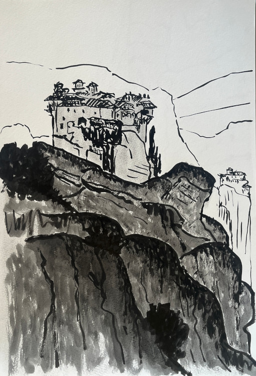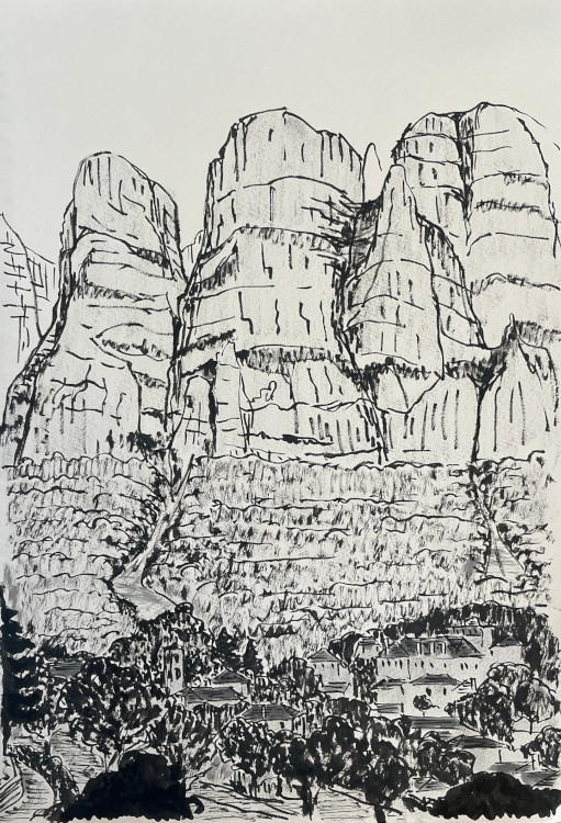 Quittant Apollon et consorts, nous remontons la Thessalie, pour aller grimper aux miracles d’aiguilles que figent les monastères orthodoxes des Météores. Sur la vingtaine qui existaient, six seulement vivent encore. Eux aussi sont en proie à la désaffection. En s’extasiant devant leurs incroyables escarpements, on ne peut s’empêcher de penser aux risques des chantiers passés. Certains ouvriers et quelques moines ont dû monter au ciel en tombant dans les précipices. Autre remarque que l’architecte ne peut s’empêcher d’émettre, s’il monte visiter le haut de ces pitons habités par la foi et le désir d’isolement : une conscience exacerbée du paysage et de la construction, n’empêche nullement d’ignorer la force de la spatialité dans son rapport au divin. Ces monastères, ceux que nous avons visités, ne proposent que des enfilades de pièces très banales qui pensent juste à épouser le relief (ce qui est déjà un grand défi) sans proposer d’espaces, à l’exception des jardins terrassés, dignes d’un rapport au vide ou au ciel.