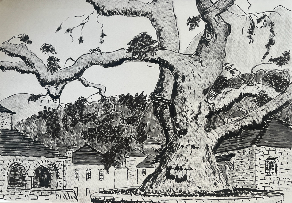 Sur les places vides et lithiques de Megalo Papigko et de son écart Micro Papigko, quel plaisir de simplement s’asseoir sur un muret près de l’église sous les gigantesques platanes, véritables notaires de la Grèce continentale. Dans ce temps suspendu, le vernaculaire fait merveille : tout est similaire quand rien ne l’est. Mais si la séduction est présente, ensorcelante même, toute cette beauté préservée ne tient encore une fois qu’avec l’aide des apports extérieurs. Sans parler des touristes, quand on aborde les gens, on s’aperçoit que la fille du restaurant à Hydra est une graphiste d’Athènes, espérant un avenir meilleur, que la tenancière de l’hôtel dans le Pinde est Sibérienne et les tailleurs de pierre Albanais.