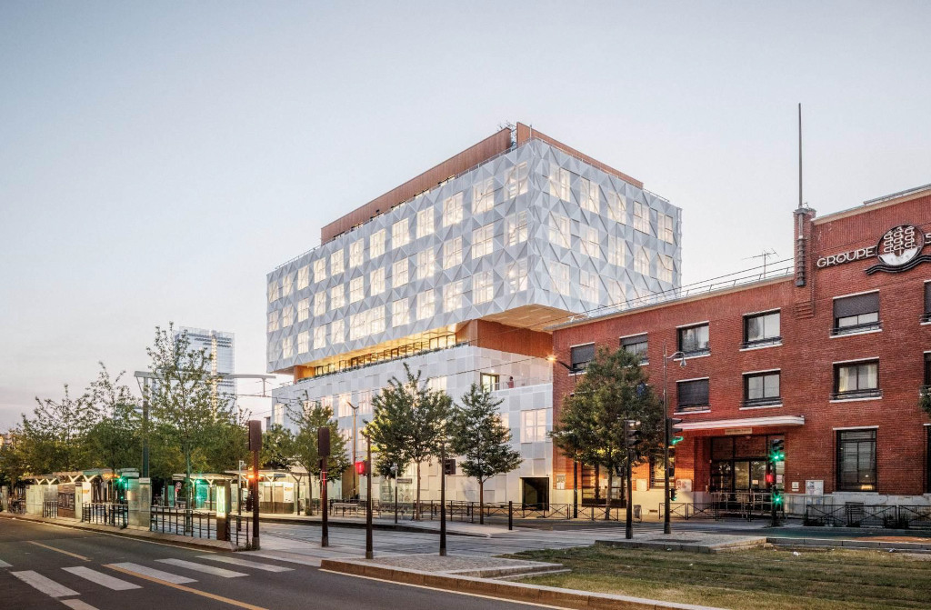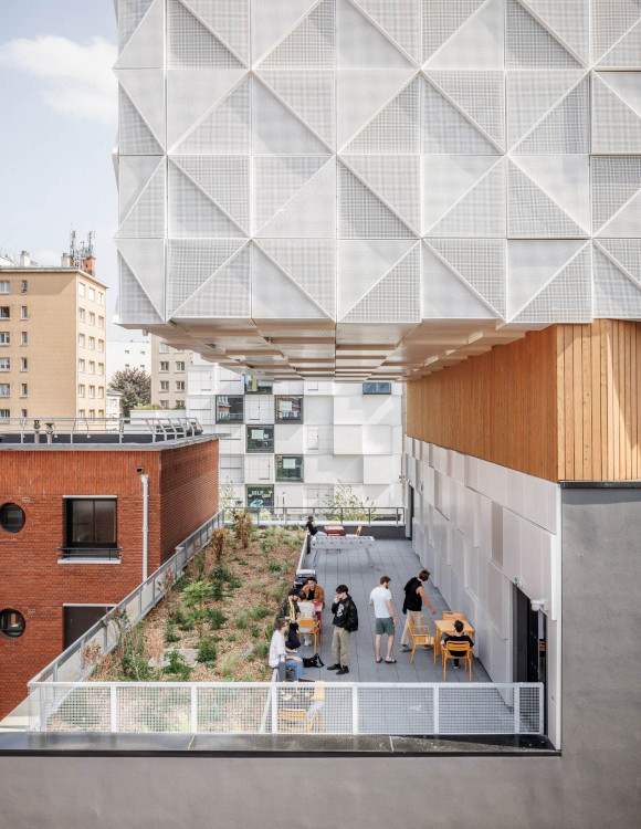 La nouvelle superstructure du bâtiment, en métal, s’élève sur plus de 18 m de surélévation. L’ensemble du programme se pare d’une enveloppe en tôle blanche perforée qui s’anime au fil de la journée et de la nuit. Des toitures-terrasses accessibles, dont plusieurs végétalisées, offrent des moments de détente aux étudiants. Un jeu avec les volumes pour apporter de la délicatesse et insuffler de la légèreté à l’ensemble.
