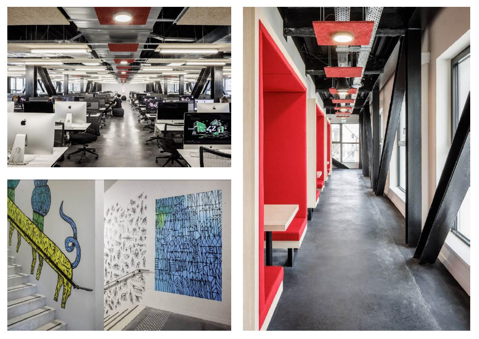 42 Paris avait pour objectif principal de doubler la capacité d’accueil. Les architectes ont pris le parti de conserver l’existant plutôt que partir d’une feuille blanche et de redensifier la parcelle sur une surface d’emprise minimale. Le site de 3 600 m² se déploie désormais sur 9 025 m², par des extensions du socle et cinq étages supplémentaires pour accueillir les 1 400 postes de travail (contre 900 auparavant). Il abrite également un amphithéâtre, une salle de sport, une salle d’enregistrement vidéo et audio, un pôle restauration, des espaces de détente intérieurs et extérieurs…