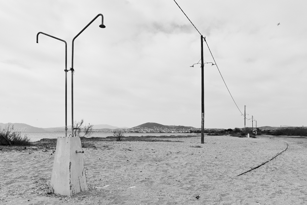 Une douche de plage attend sur son socle de béton — hors saison, hors usage, hors temps.