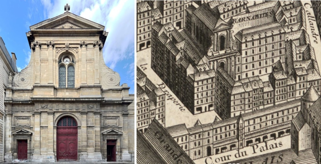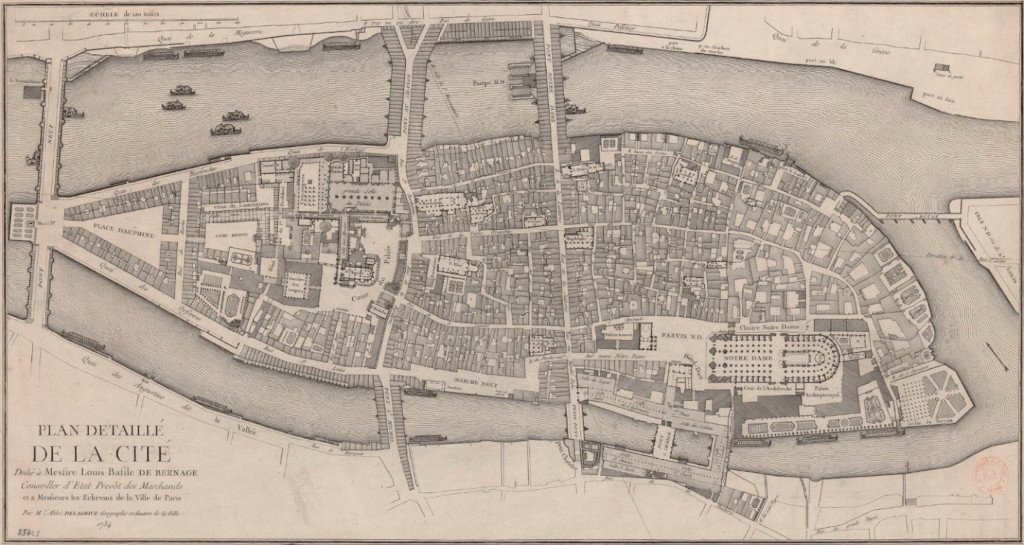 Des édifices religieux disparus de la Cité, après avoir été nationalisés en 1789 puis vendus à des particuliers, il ne reste aujourd’hui que peu d’éléments. Le portail gothique de l’église Saint-Pierre-aux-Bœufs a été remonté par Lassus en 1839 comme portail principal de l’église Saint-Séverin, et la sobre façade de l’église conventuelle des Barnabites, élevée par Cartaud en 1705, est devenue en 1863, après quelques modifications dues à Baltard, celle de Notre-Dame-des-Blancs-Manteaux dans le Marais. Il suffit de jeter un œil sur les plans anciens, et notamment sur celui dit de Turgot, exécuté de 1734 à 1736 en perspective cavalière axonométrique par l’architecte et cartographe Louis Bretez, pour se rendre compte à quel point les lieux de culte étaient proches les uns des autres, étroitement imbriqués dans le tissu urbain qui ne laissait que les façades dégagées, sans espace suffisant toutefois devant elles pour qu’il fût possible de les embrasser d’un seul regard.